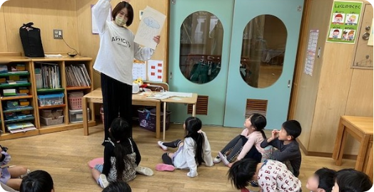 4歳児、5歳児は外部講師を招き、歌やリズム遊び、ゲームなどを通して、子どもたちが楽しく自然に英語に親しめる時間を設けています。遊びの中で言葉や表現を学び、音楽と英語への興味と自信を育てます。