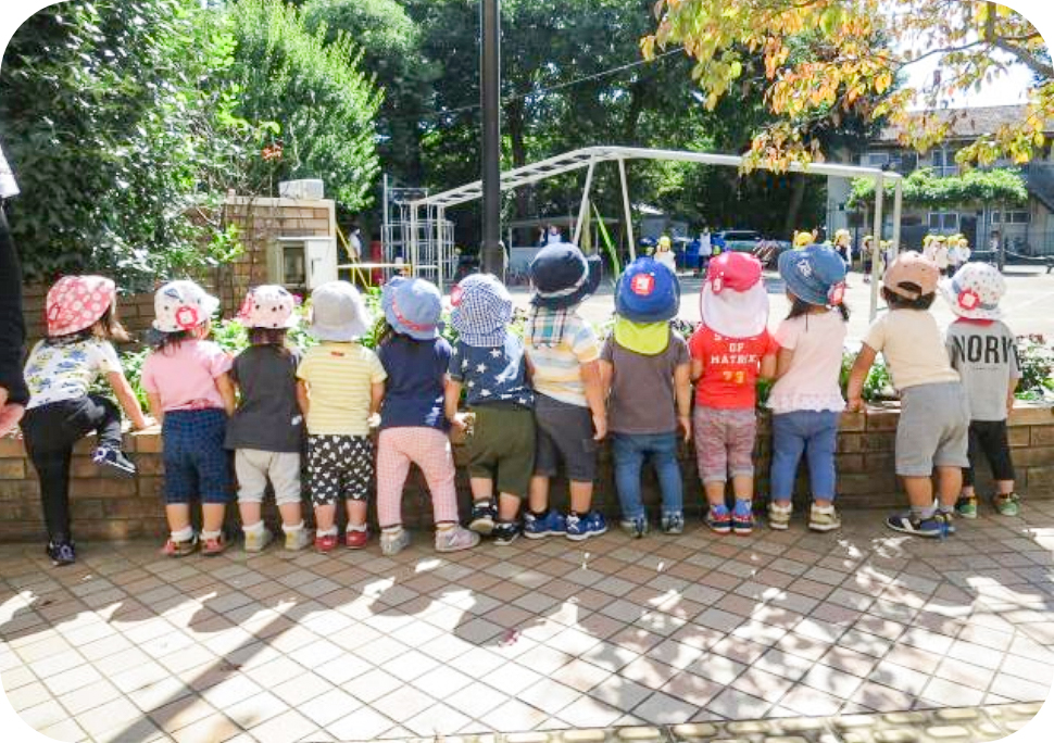 広い園庭には、大きな樹木や四季折々の草花、様々な虫との出会いがあります。春には園庭の梅をもぎ梅ジュースを作ったり、秋にはみかん狩りをして食します。また、珍しい虫や昆虫との豊かな出会いを楽しんでいます。