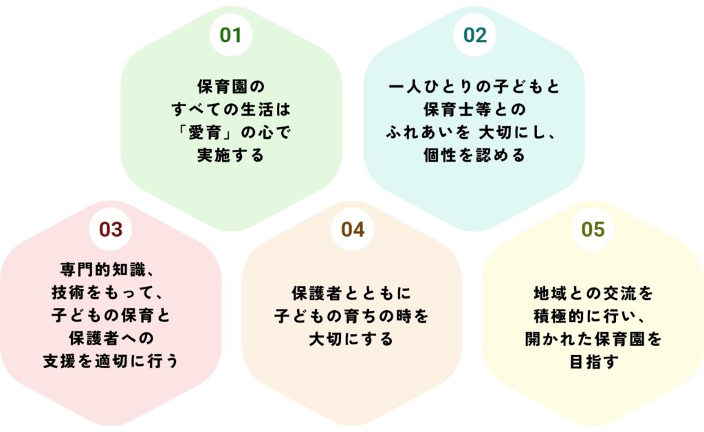 当園の「保育方針」とは、保育目標を達成するために、私たちが日々どのような考え方に基づき、お子様と関わっていくかを示すものです。