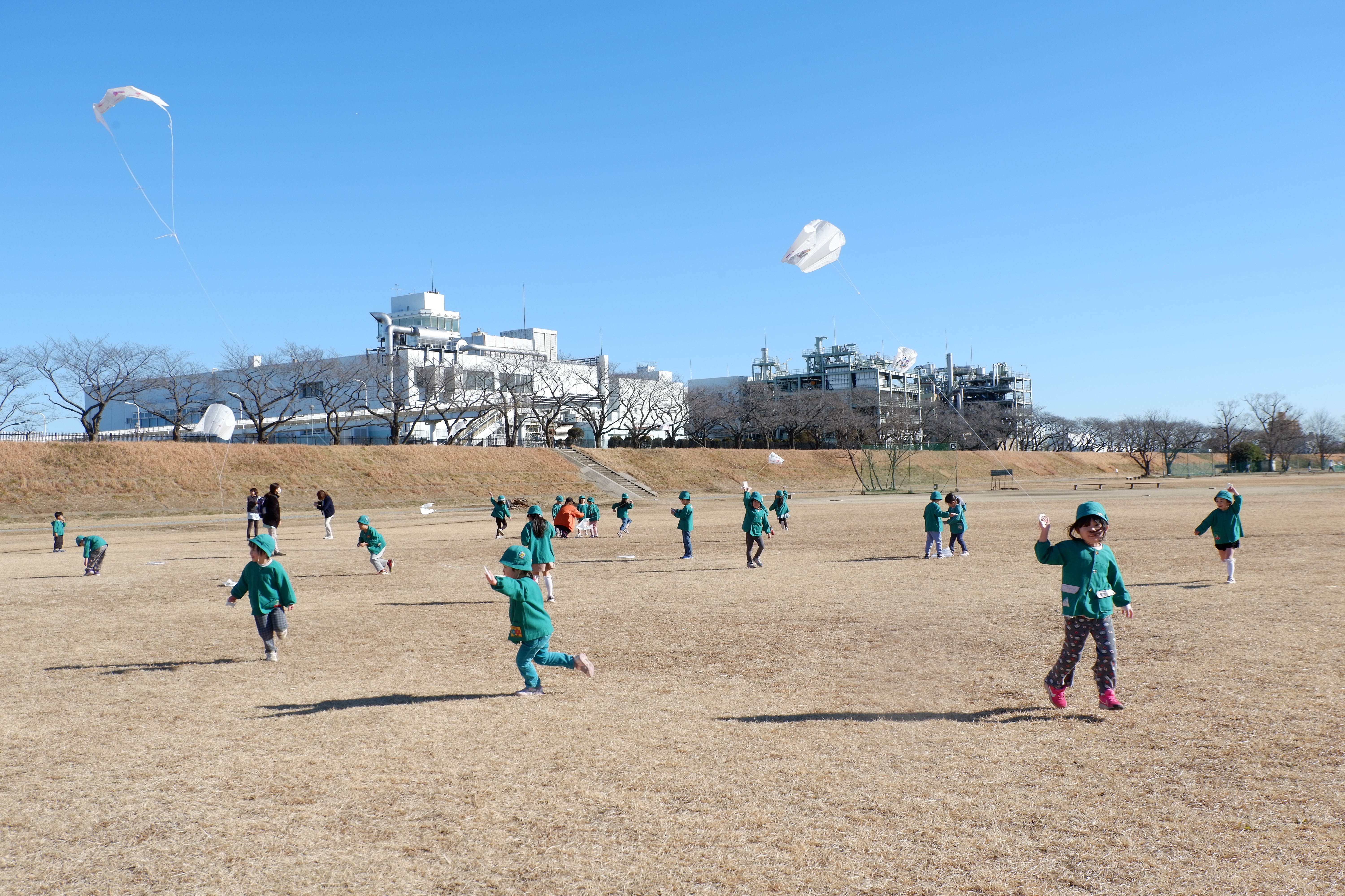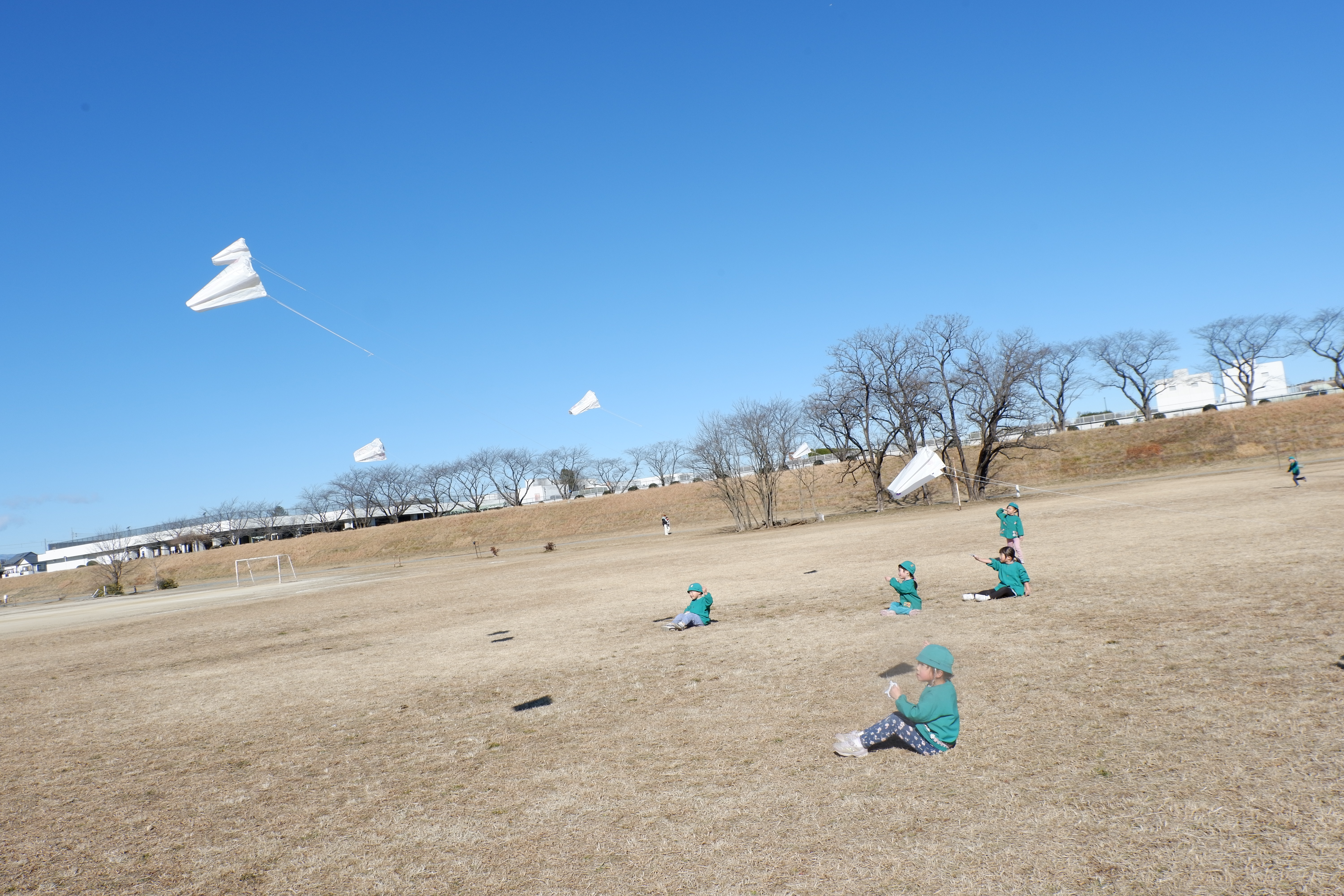 1月23日に年中・年長クラス一緒に広いグラウンドへ凧上げをしに行きました。