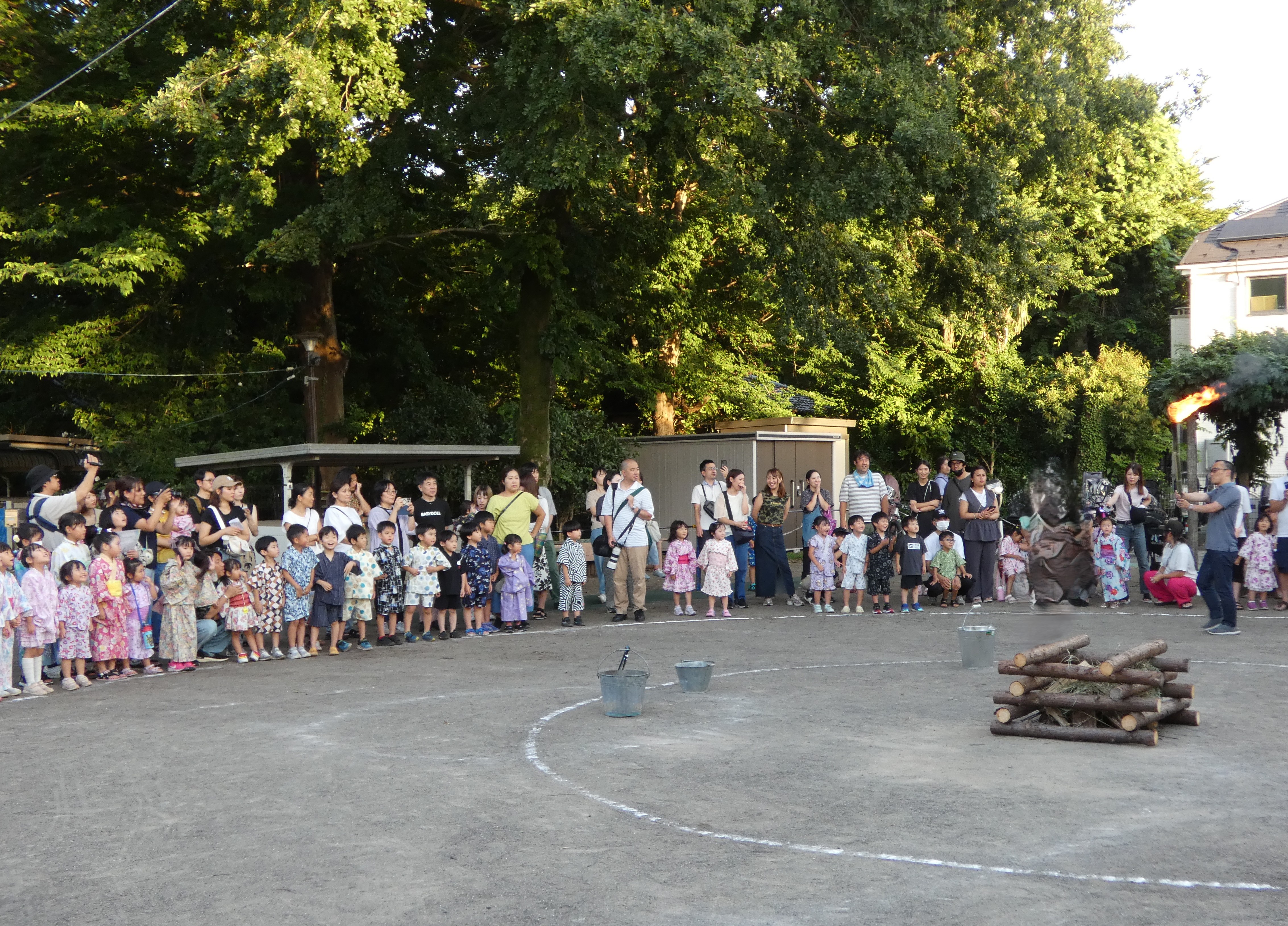 大焚火を囲み園児たちの唄う歌や踊りをどうぞご覧ください。 花火を見た後は、赤い提灯のトンネルを最後に潜って帰りましょう。