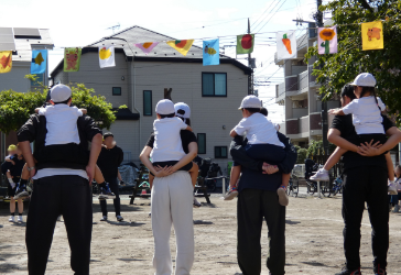 園児たちのかけっこや声援など、保育園の園庭で運動会をご一緒に楽しみましょう。